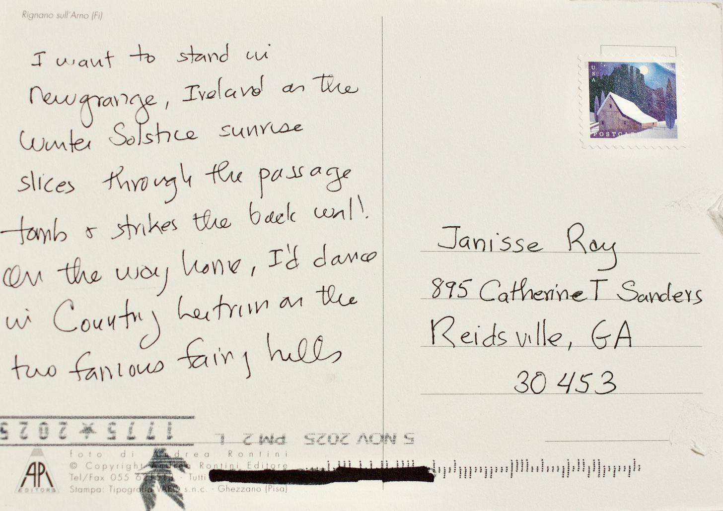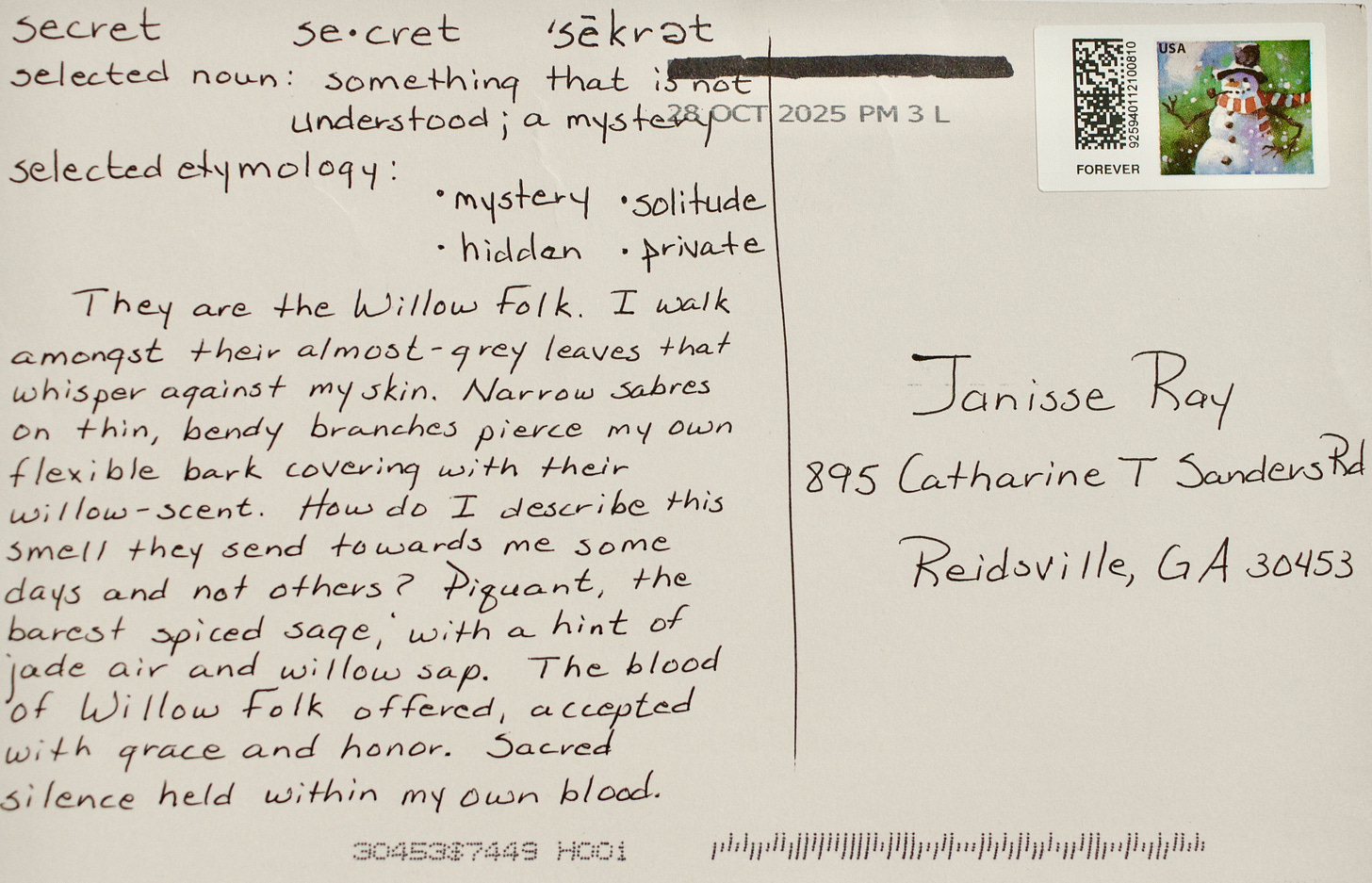 I hope you take a moment to hover over the postcard, as if you—like I—have just pulled it from the mailbox. Sit with each a minute. The dirt road is empty. Leaves have fallen from the trees. The goldenrod and the life-a-lasting are dry stalks filled with seeds.