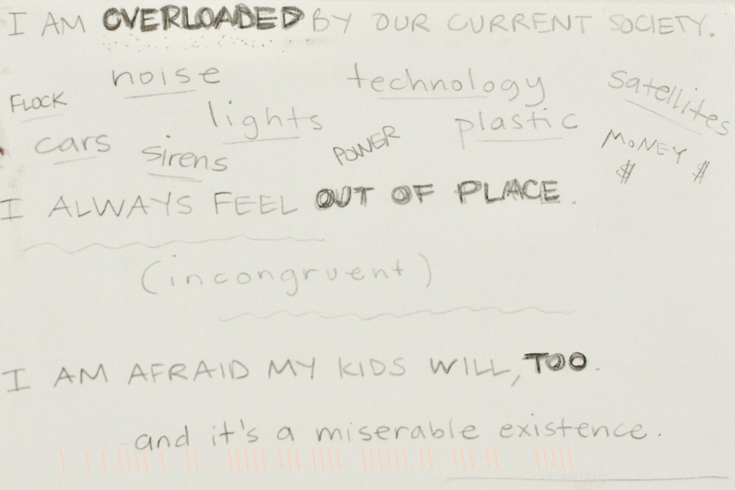 I don’t like our world & am powerless to change it. I’ve been trying. I am overloaded by our current society. noise. flock. cars. lights. sirens. technology. power. plastic. satellites. money. I always feel out of place. (incongruent) I am afraid my kids will, too. and it’s a miserable existence.